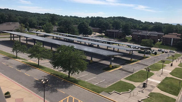 The largest Neighborhood Solar installation to date at 1.2 megawatts, the 3,500 solar modules will provide enough energy to power more than 130 homes for a year. This facility is located on the campus of Southeast Missouri State University, providing covered parking for the Show Me Center. Construction began in October 2021, and it went into service in July 2022.