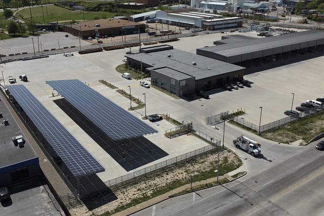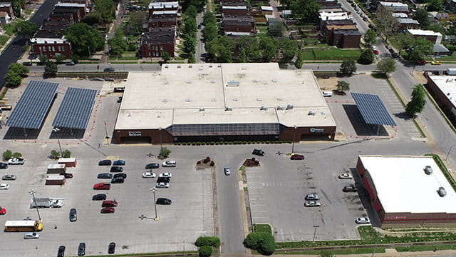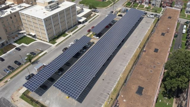 This neighborhood solar installation is located at Delmar DivINe in St. Louis' West End neighborhood. In a year, the panels are expected to provide enough energy to power about 35 homes. They also offer shade and weather protection for almost 200 employees and visitors to the nonprofit's campus. Delmar DivINe provides shared space and capacity-building programs for 39 nonprofit and retail tenants that deliver a variety of social services as well as financial and career assistance to the community. The Energy Center went into service in August 2023.