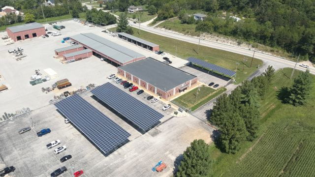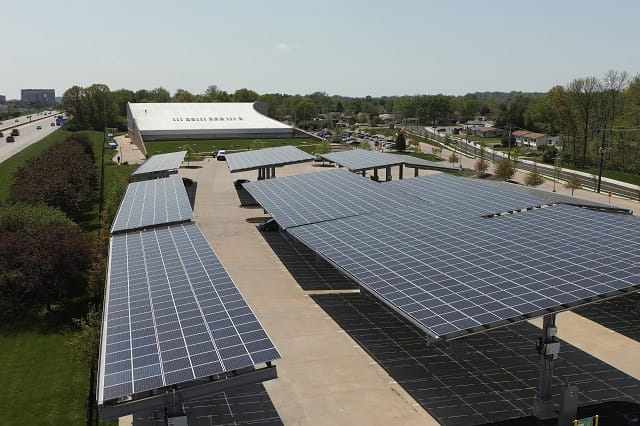 This neighborhood solar installation is located at the Maryland Heights Community Center. The canopy-style panels maximize existing space and add shade and weather protection for parking at the community center without losing a single spot. Together, the 1,335 solar modules will provide about 500 kilowatts of energy per year, which is equivalent to the energy used by about 55 homes over that same time. Construction began in fall 2022, and it went into service in April 2023.